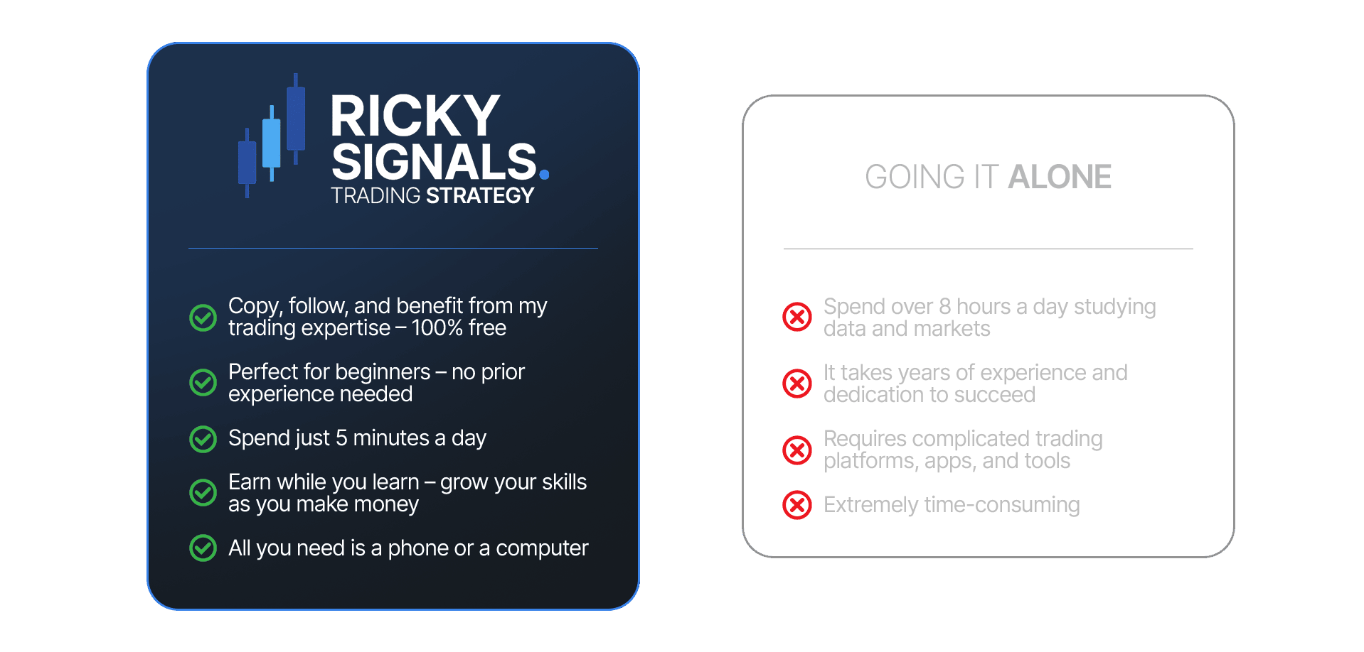 Just a few minutes. When Ricky sends out a signal, you get notified and can copy the trade in under 5 minutes. It’s designed for people who want results but don’t have hours to spend in front of charts.