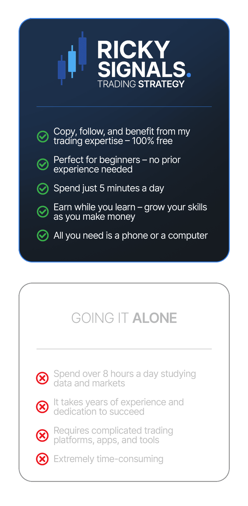 Ricky Signals is a free signal room where you can copy trades from Ricky — a professional trader followed by over 2,000 people. Every day, you’ll receive ready-to-use trading signals directly on your phone. No charts to study, no complex strategies. Just copy, paste, and trade.